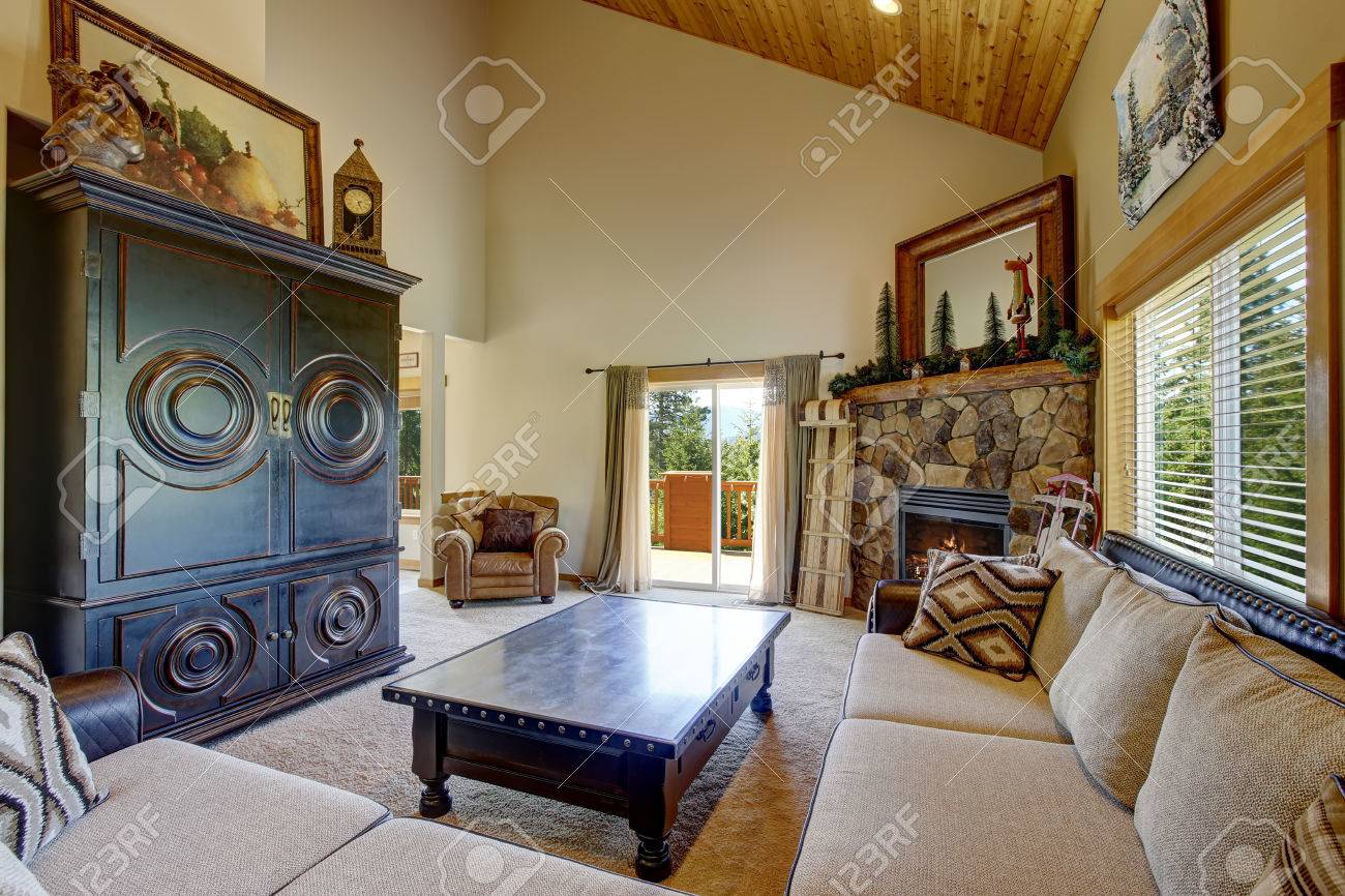 Salle De Sejour Confortable Avec Un Haut Plafond Voute En Bois Et