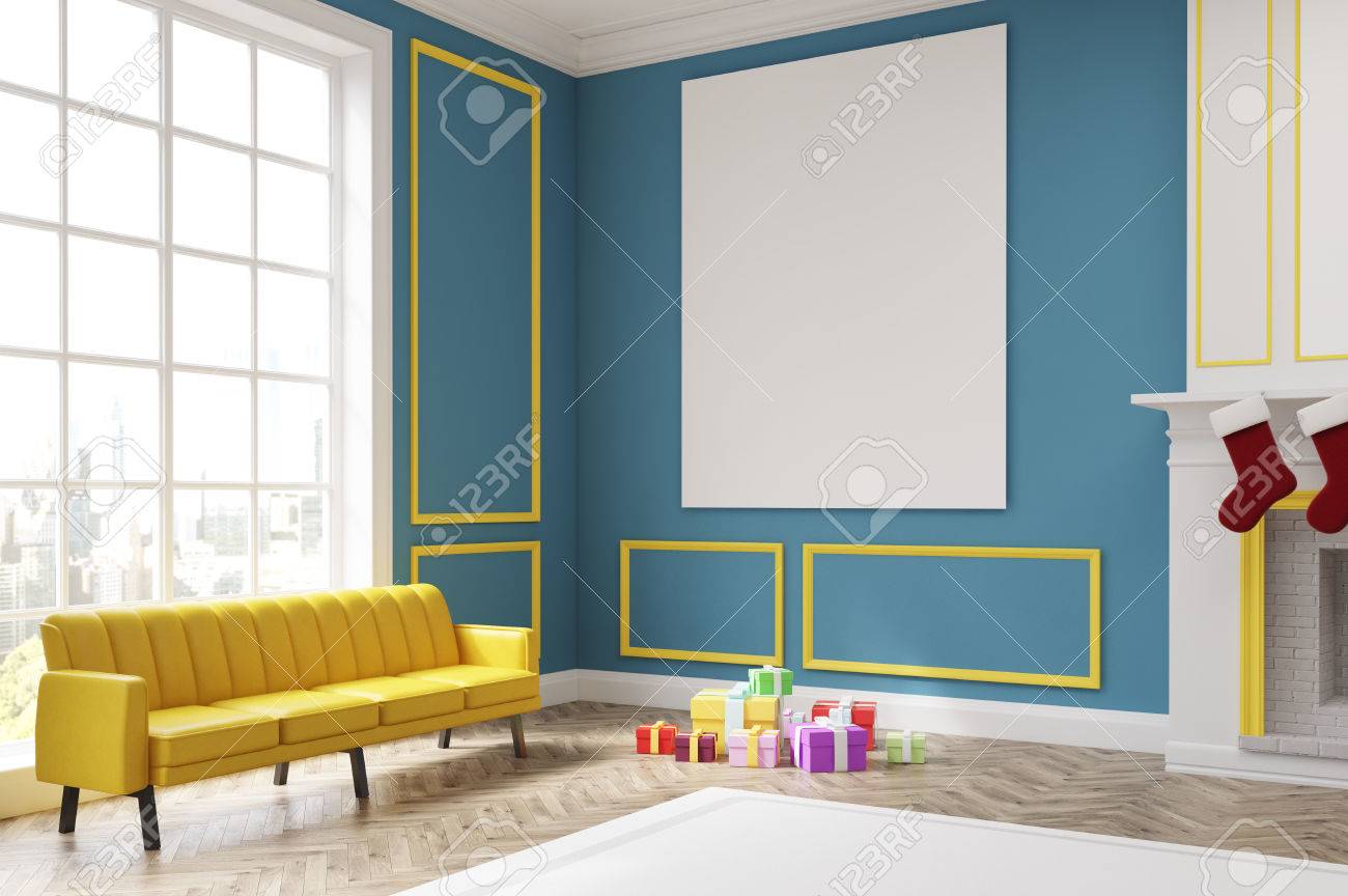 Coin D Une Salle De Sejour Avec Des Murs Bleus Cheminee Et